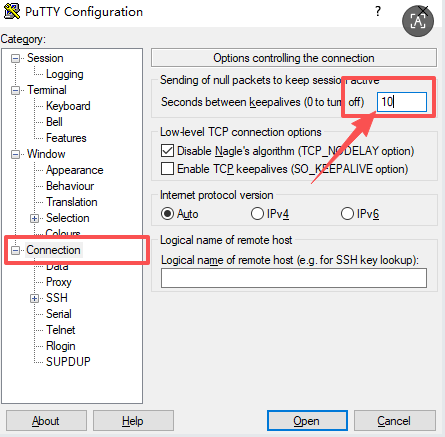 注意,这里的session标识非常有用,在session里可以设置当无操作时,每10秒钟向服务器发送一次空包,以便使客户端这边不断线putty不退出登录状态。